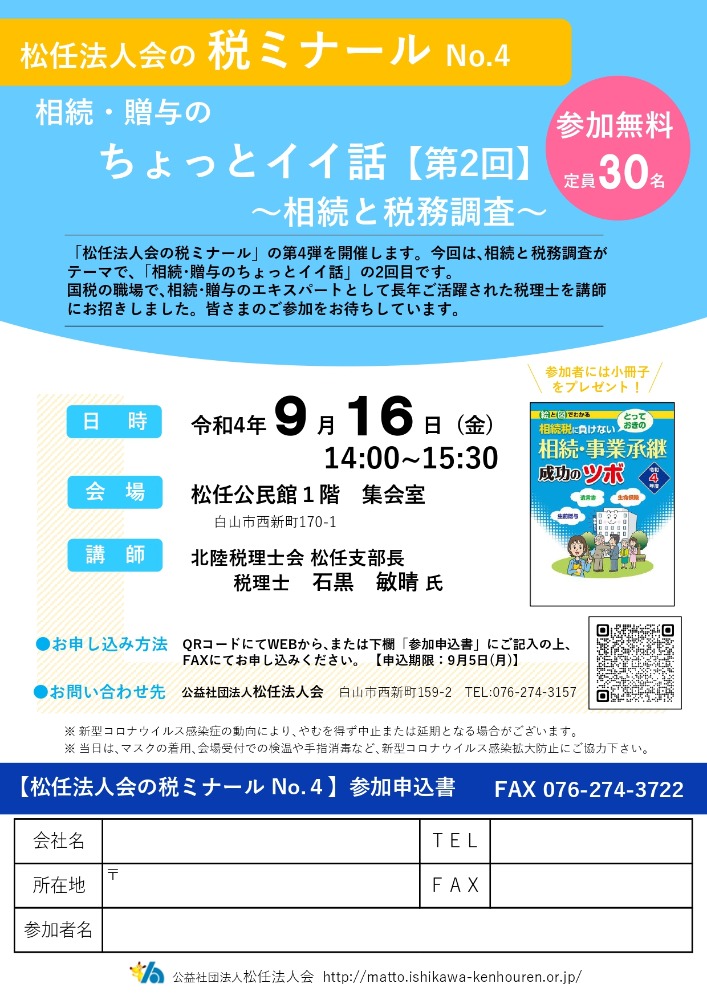 2022.9.16 (金) 14:00~15:30 無料 【研修会:税ミナール No.4】相続・贈与のちょっとイイ話《第2回》 詳細ダウンロード R4.9.16税ミナール④(講師_石黒敏晴氏)PDF.pdf お申込参加ご希望の方は下記の『申込フォーム』よりお申込み下さい。定員 30名【申込締切:9月10日(火)】 お申込はこちらから もどる