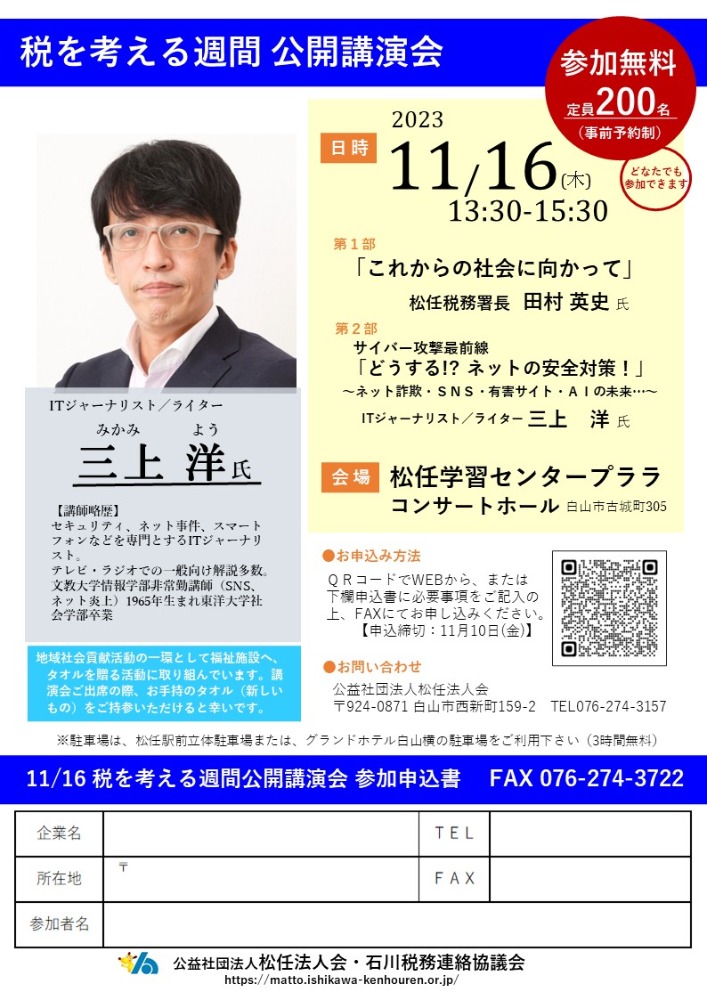 2023.11.16 (木) 13:30~15:30 無料 【三上洋氏】税を考える週間 公開講演会のご案内 詳細ダウンロード (法人会)R5.11.16税を考える週間公開講演会【三上洋氏】.pdf お申込参加ご希望の方は下記の『申込フォーム』よりお申込み下さい。定員 200名【申込締切:11月10日(金)】 申込フォーム もどる