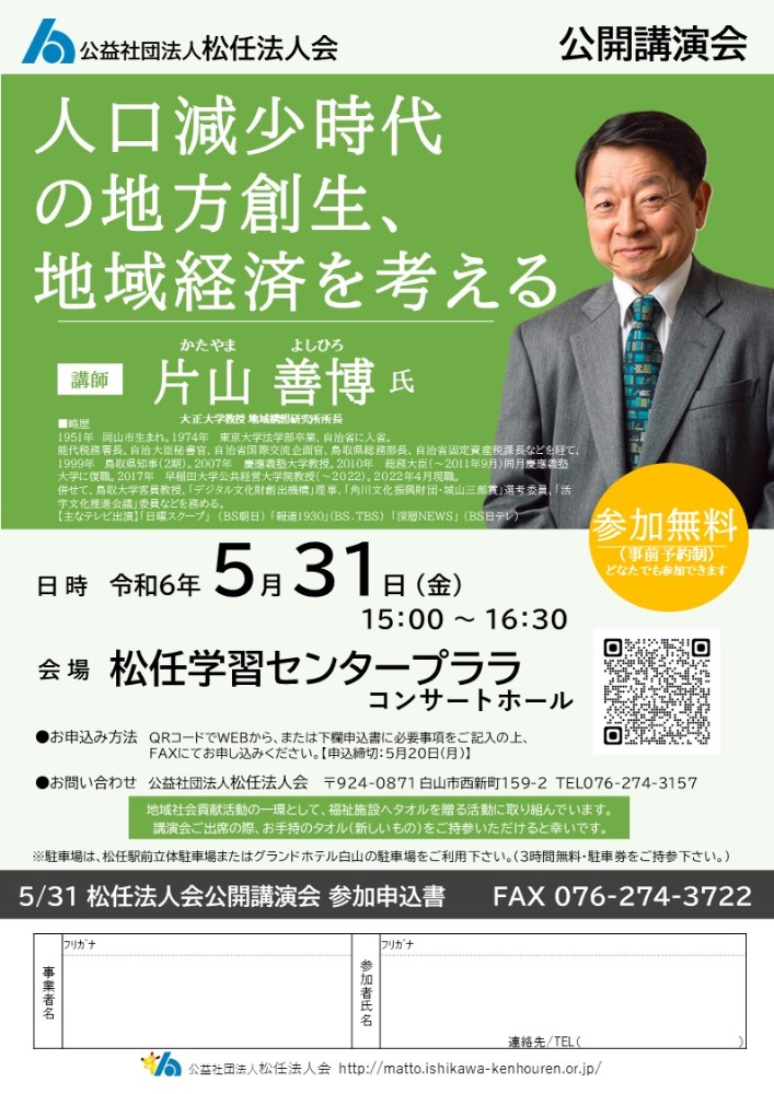 2024.5.31 (金) 15:00~16:30 無料 【片山善博氏】松任法人会 公開講演会 詳細ダウンロード R6.5.31片山氏講演会チラシ.pdf お申込参加ご希望の方は下記の『申込フォーム』よりお申込み下さい。【申込締切:5月20日(月)】 申込フォーム もどる