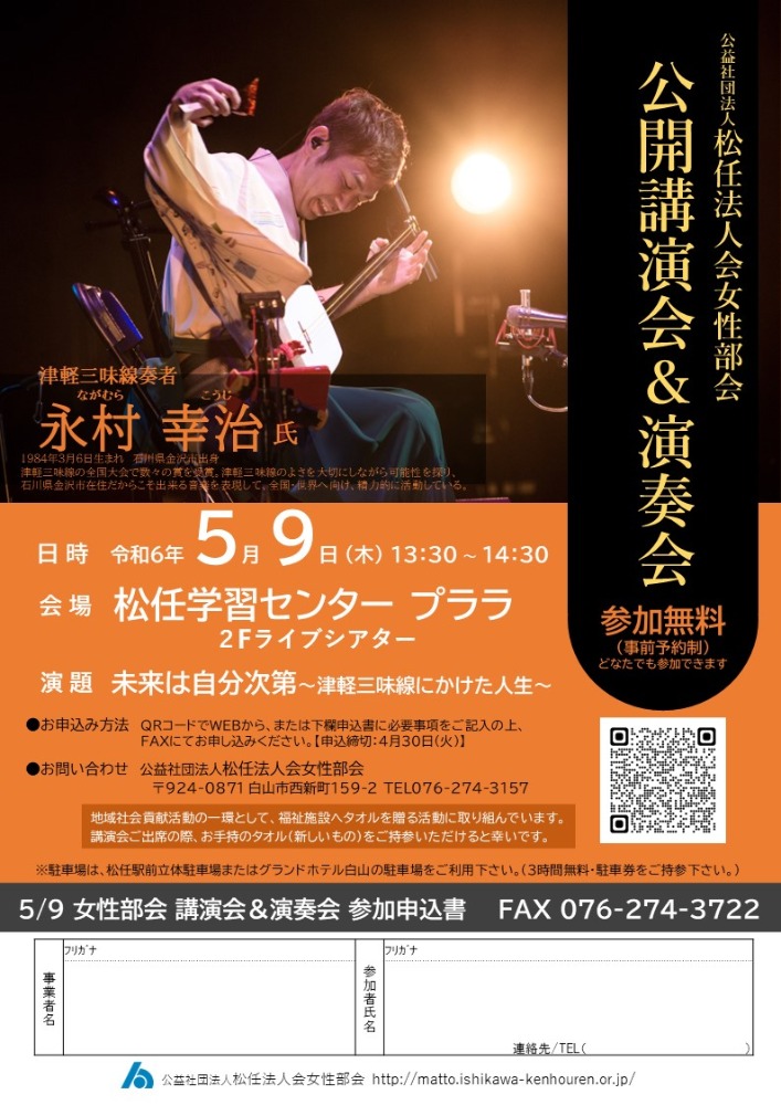 2024.5.9 (木) 13:30~14:30 無料 【永村幸治氏】女性部会 公開講演会&津軽三味線演奏会 詳細ダウンロード R6.5.9講演会&演奏会チラシ.pdf お申込参加ご希望の方は下記の『申込フォーム』よりお申込み下さい。【申込締切:4月30日(火)】 申込フォーム もどる