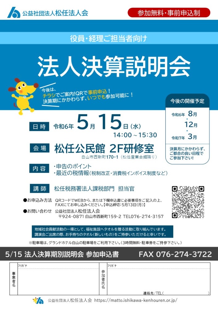 2024.5.15 (水) 14:00~ 無料 【法人決算説明会】 日時:令和6年5月15日(水)14:00~15:30場所:松任コミュニティセンター(旧:松任公民館) 2階研修室 白山市西新町170-1(松任産業会館隣) ※駐車場はグランドホテル白山の駐車場をご利用ください(3時間無料)内容申告のポイント最近の税情報(税制改正、消費税インボイス制度など)講師 松任税務署 法人課税第一部門担当官 参加申込 【説明会参加】申込 資料送付説明会に参加できない方で、資料等の送付をご希望の方は以下よりお申込み下さい。 【資料送付】申込 もどる