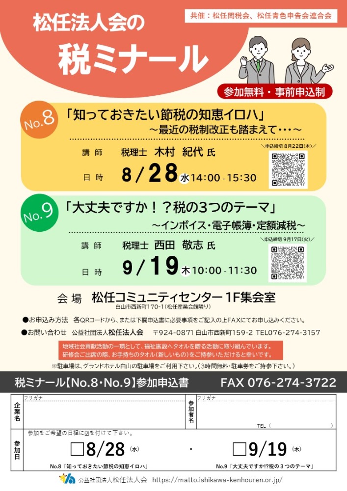 2024.8.28 (水) 14:00~15:30 無料 【税ミナールNo.8】知っておきたい節税の知恵イロハ 詳細ダウンロード R6.8.28・9.19_松任法人会の税ミナールNo8.9.pdf お申込参加ご希望の方は下記の『申込フォーム』よりお申込み下さい。定員 50名【申込締切:8月22日(木)】 申込フォーム もどる