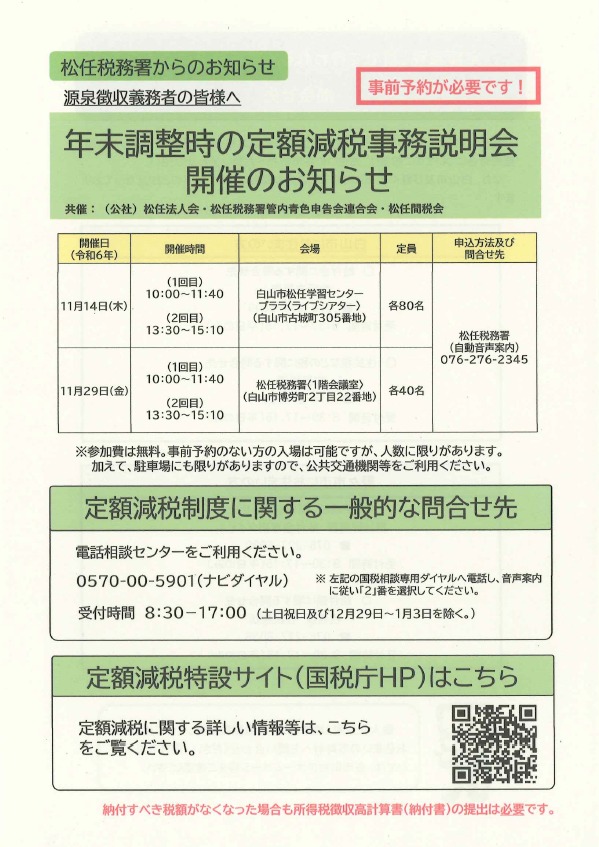 2024.11.14 (木) 10:00~ 無料 【松任税務署共催】年末調整時の定額減税事務説明会① 日時 令和6年11月14日(木) (1回目)10:00~11:40 (2回目)13:30~15:10場所 白山市松任学習センター 2階 ライブシアター もどる