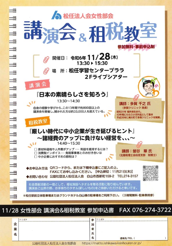 2024.11.28 (木) 13:30~ 無料 【多賀千之氏】女性部会 公開講演会&租税教室 詳細ダウンロード 20241016095852613.pdf お申込参加ご希望の方は下記の『申込フォーム』よりお申込み下さい。【申込締切:11月21日(木)】 申込フォーム もどる