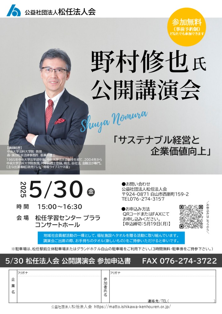 2025.5.30 (金) 無料 【野村修也氏】松任法人会 公開講演会 詳細ダウンロード R7.5.30_野村氏_講演会チラシ.pdf お申込参加ご希望の方は下記の『申込フォーム』よりお申込み下さい。【申込締切:5月19日(月)】 申込フォーム もどる