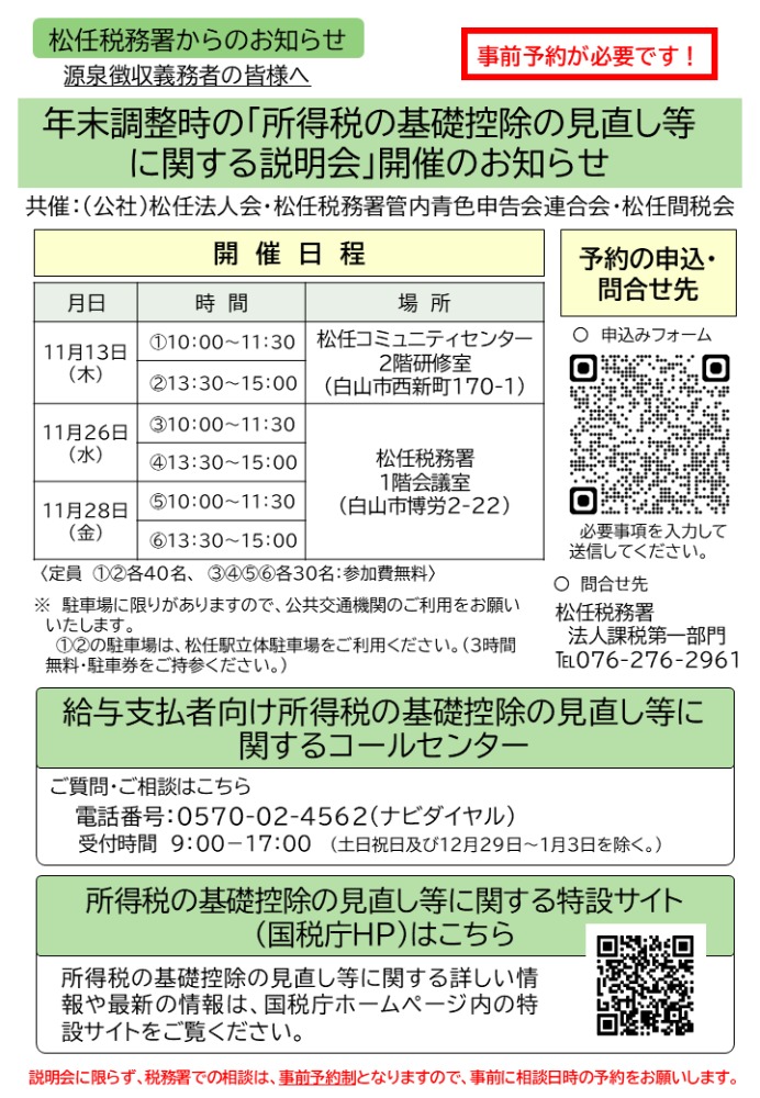 2025.11.28 (金) 9:48~9:48 無料 【松任税務署共催】年末調整・基礎控除等説明会⑤⑥ 日時 令和7年11月28日(金) (5回目)10:00~11:30 (6回目)13:30~15:00場所 松任税務署 1F会議室※会場で賃金台帳を販売致します。(40円/1枚) 予約フォーム もどる