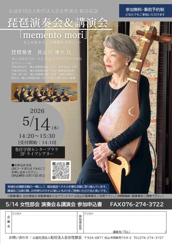 2026.5.14 (木) 14:20~15:30 無料 【長谷川凍水氏】女性部会 琵琶演奏会&公開講演会 詳細ダウンロード R8.5.14演奏会・講演会チラシ.pdf お申込参加ご希望の方は下記の『申込フォーム』よりお申込み下さい。【申込締切:5月11日(月)】 申込フォーム もどる