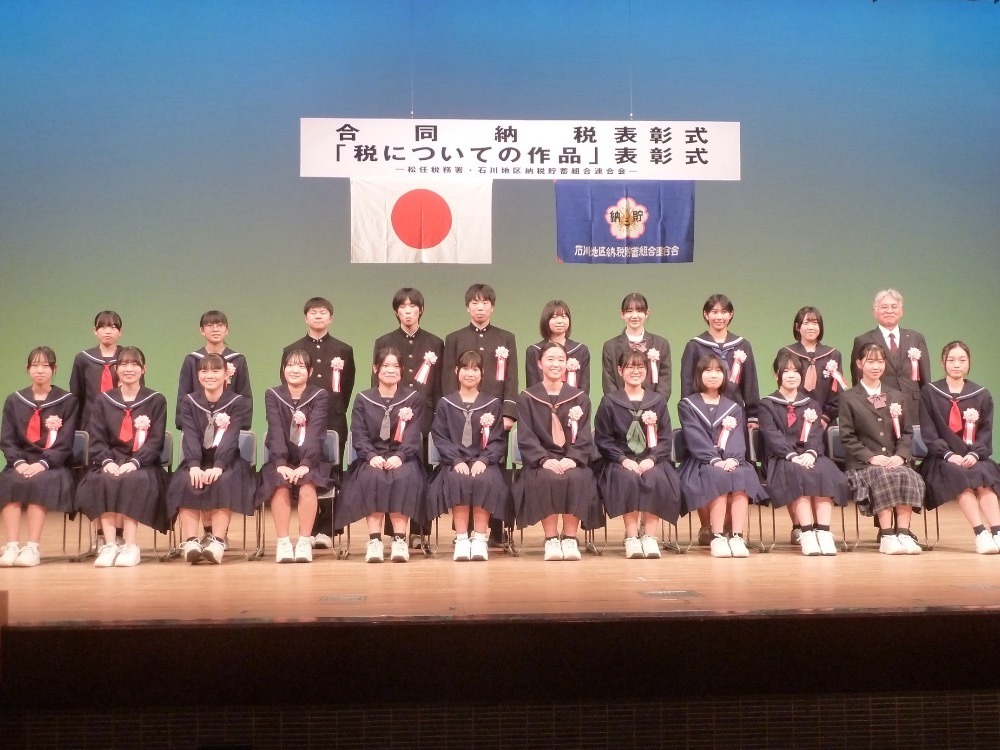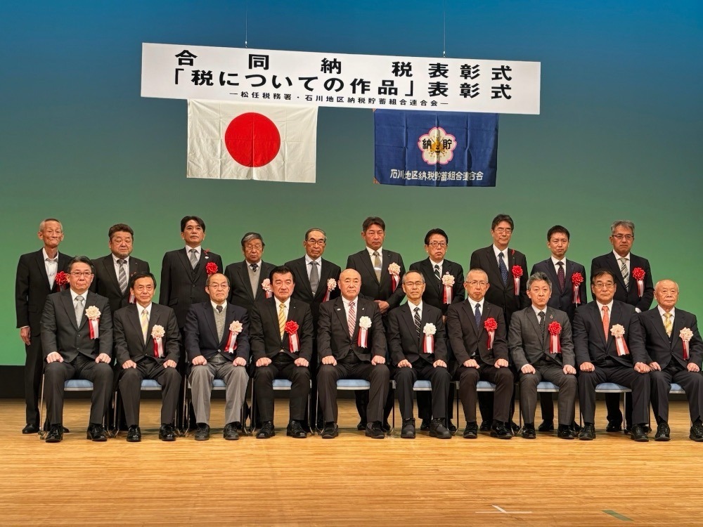 令和7年11月19日(水)、松任文化会館ピーノにおいて、松任税務署との共催により「合同納税表彰式」並びに「中学生の税についての作品表彰式」を開催いたしました。合同納税表彰式では10名の方が納税表彰を受章されました。続いて行われた、税についての作品表彰式では金賞を受賞した中学生26名の表彰が行われ、併せて、作品募集への協力が顕著な光野中学校に感謝状が贈呈されました。